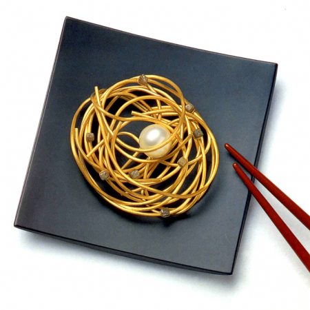 - Escultura Espaguettis Oro amarillo, brillantes en bruto y perla australiana.